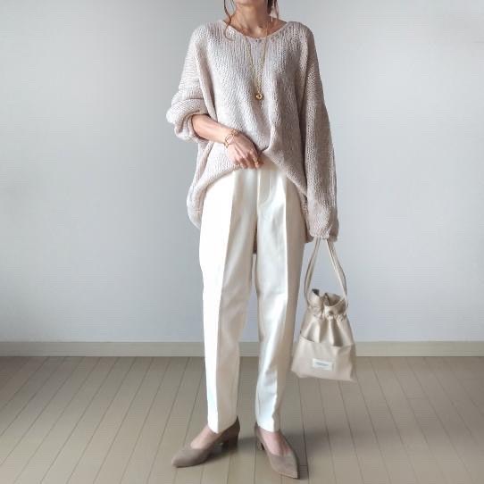 注目のホワイトパンツが、とにかくかっこいい👏カラーの雰囲気を合わせた、ふんわりニットとの組み合わせが絶妙です👌素敵ですね🥰大人なきれいめにぴったりなテーパードパンツ🙌
