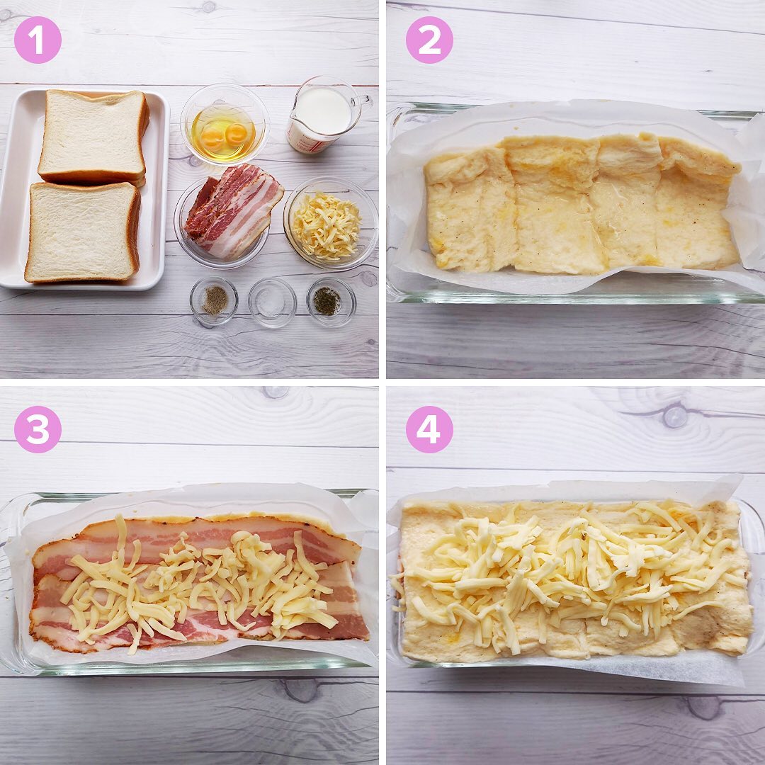 4.(3)の上に、ベーコン2枚、ピザ用チーズ30gをのせ、食パン4切れ分でフタをする。
