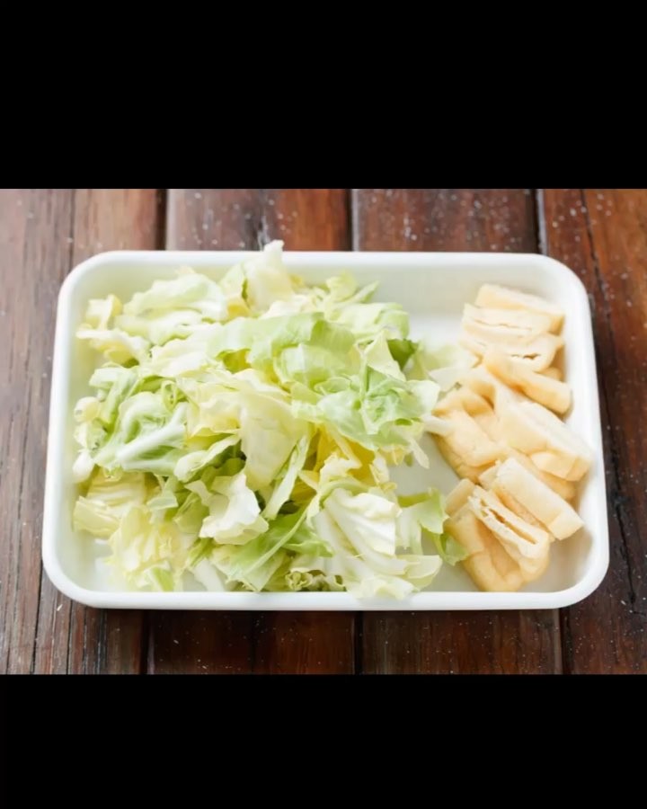 ①春キャベツは手でちぎる。油揚げは、ペーパータオルで余分な油を抑え、短冊切りにする。