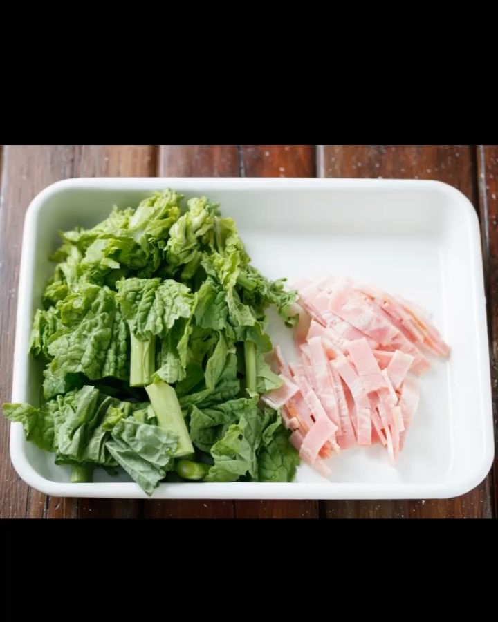 ①菜の花は、長さを3〜4等分に切る。ベーコンは短冊切りにする。