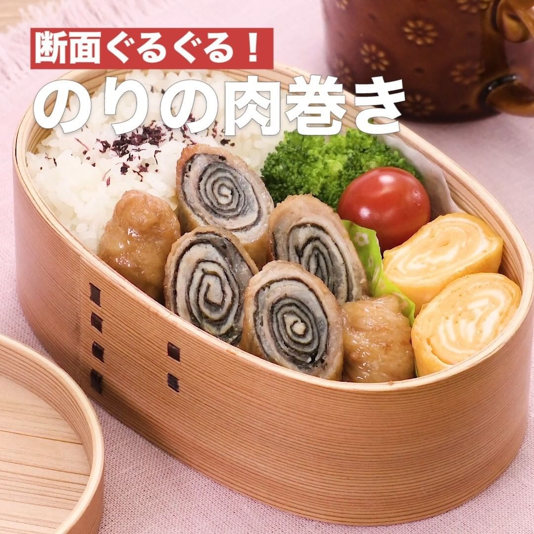 豚肉と味付けのりをくるくると巻いて、断面可愛い簡単おかずを作ります。包丁いらず、少ない材料でできるので、お弁当おかずにぴったりです。
