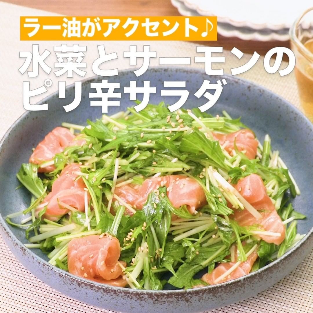 ⑦<ラー油がアクセント♪水菜とサーモンのピリ辛サラダ>