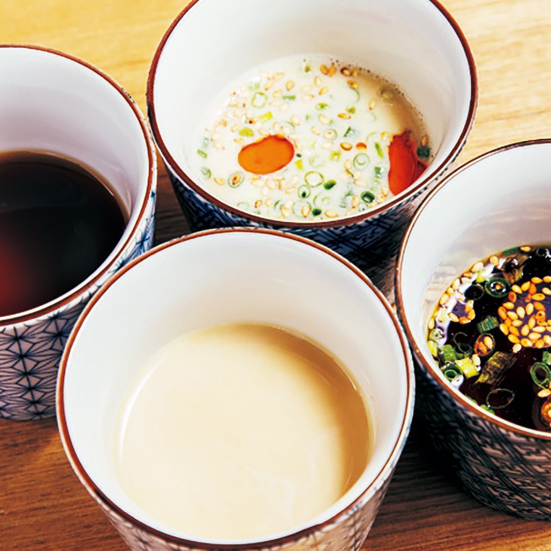 ①「 冷ざる(くろ・辛汁)」¥600。“蕎麦は手打ちが一番”の概念をくつがえす味わい。香りも喉ごしも申し分なし ②鰹出汁をベースにしたそばつゆは、全4種から選ぶことができる。なかには特製トマト汁を加えた変わり種も