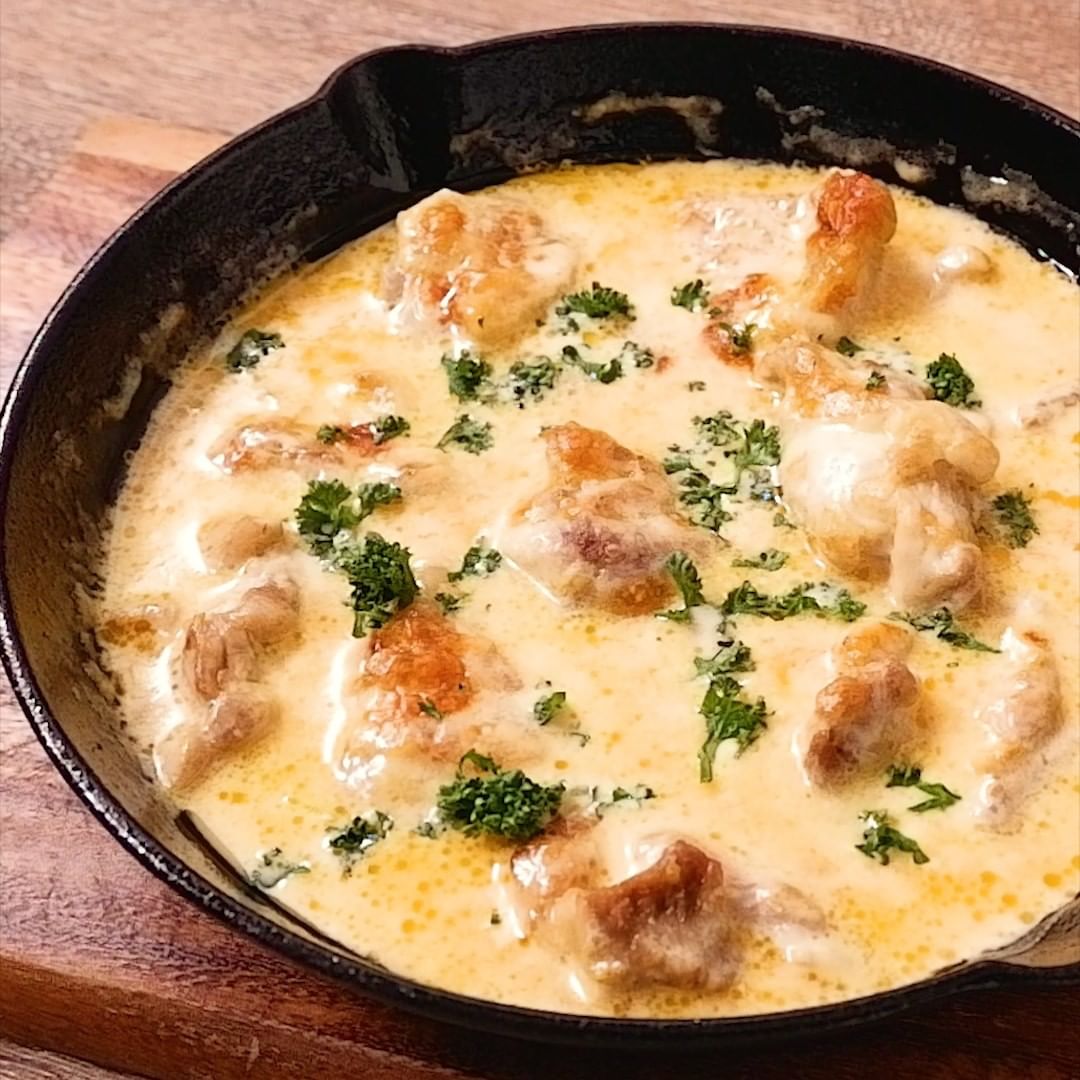 『スキレットで作る たっぷりチーズのシュクメルリ』