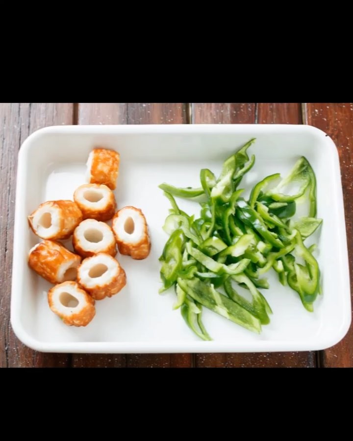 ①香ばし生ちくわは、溝のところから手でちぎる。ピーマンは、縦半分に切ってヘタと種を取り、斜め千切りにする。