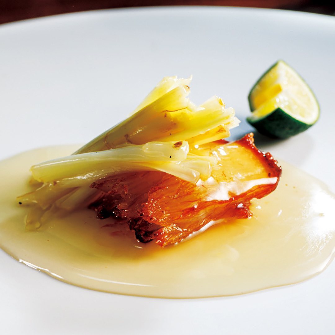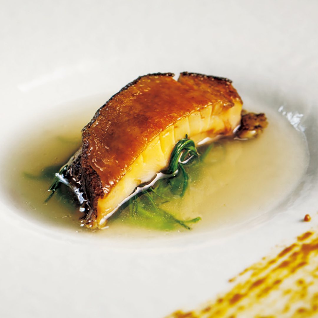 ②ふっくら蒸した蝦夷アワビのステーキは、アワビの出汁と肝のソースでいただく