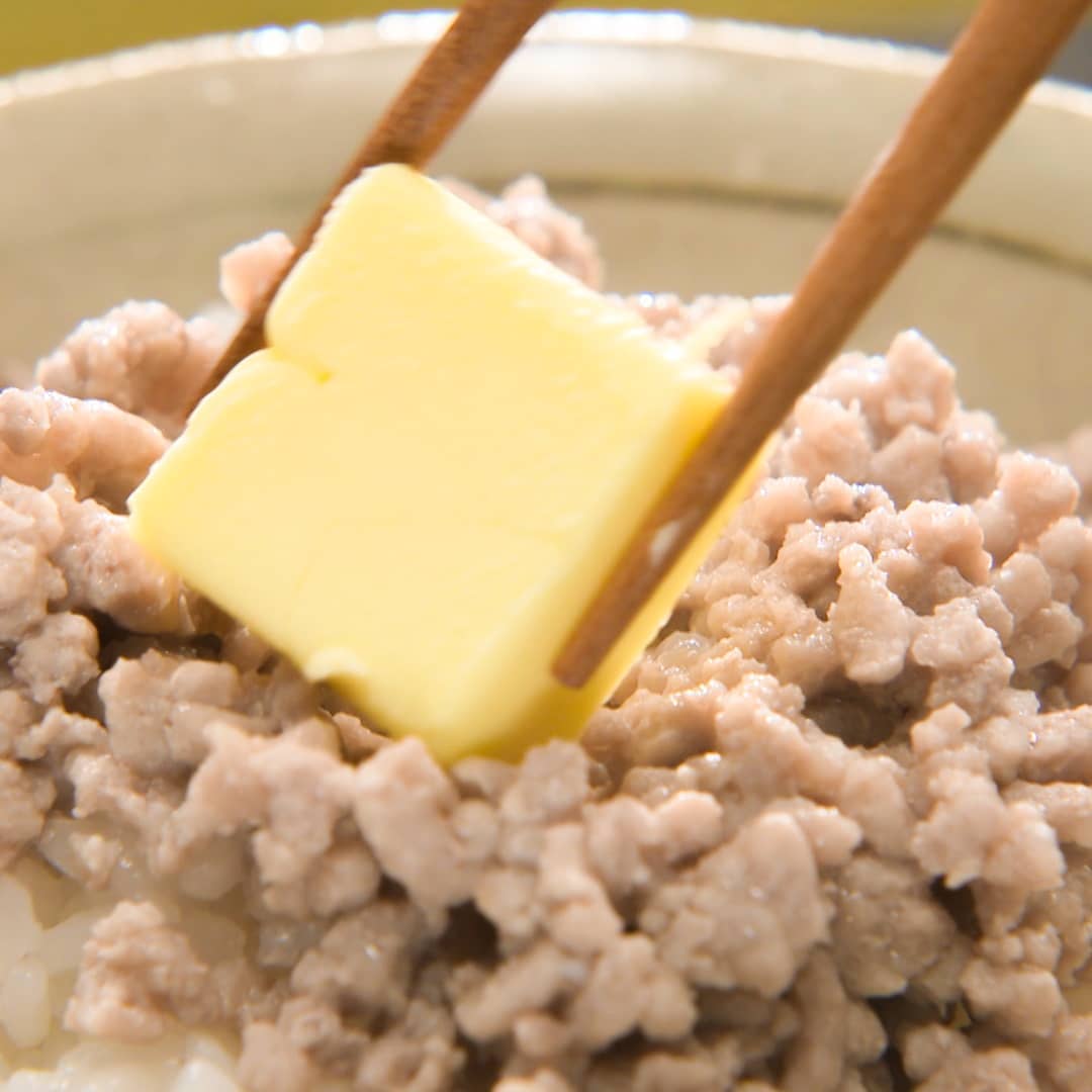 ④ご飯の上に肉そぼろ、バター(適量)をのせたら完成!
