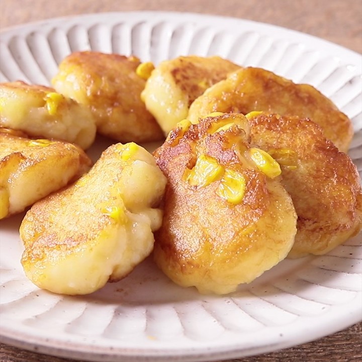 3. 熱いうちにフォークで潰します。1、ピザ用チーズ、コーンを入れ、よく混ざったら片栗粉を入れて混ぜます。