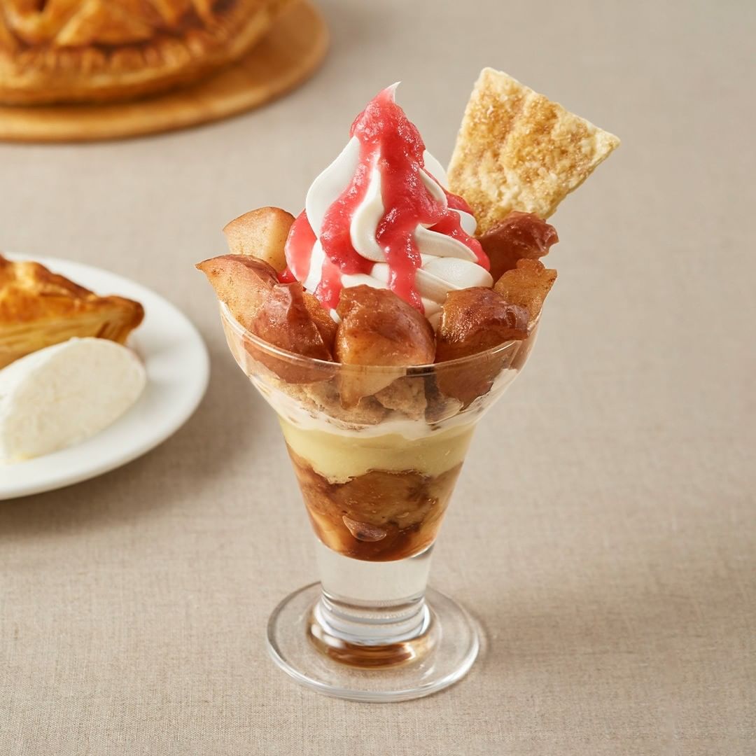 皮ごと焼き上げて甘みを引き出したりんごに、スイートポテトとチーズクリームを合わせ、ジャージー牛乳のソフトクリームをトッピングしました。