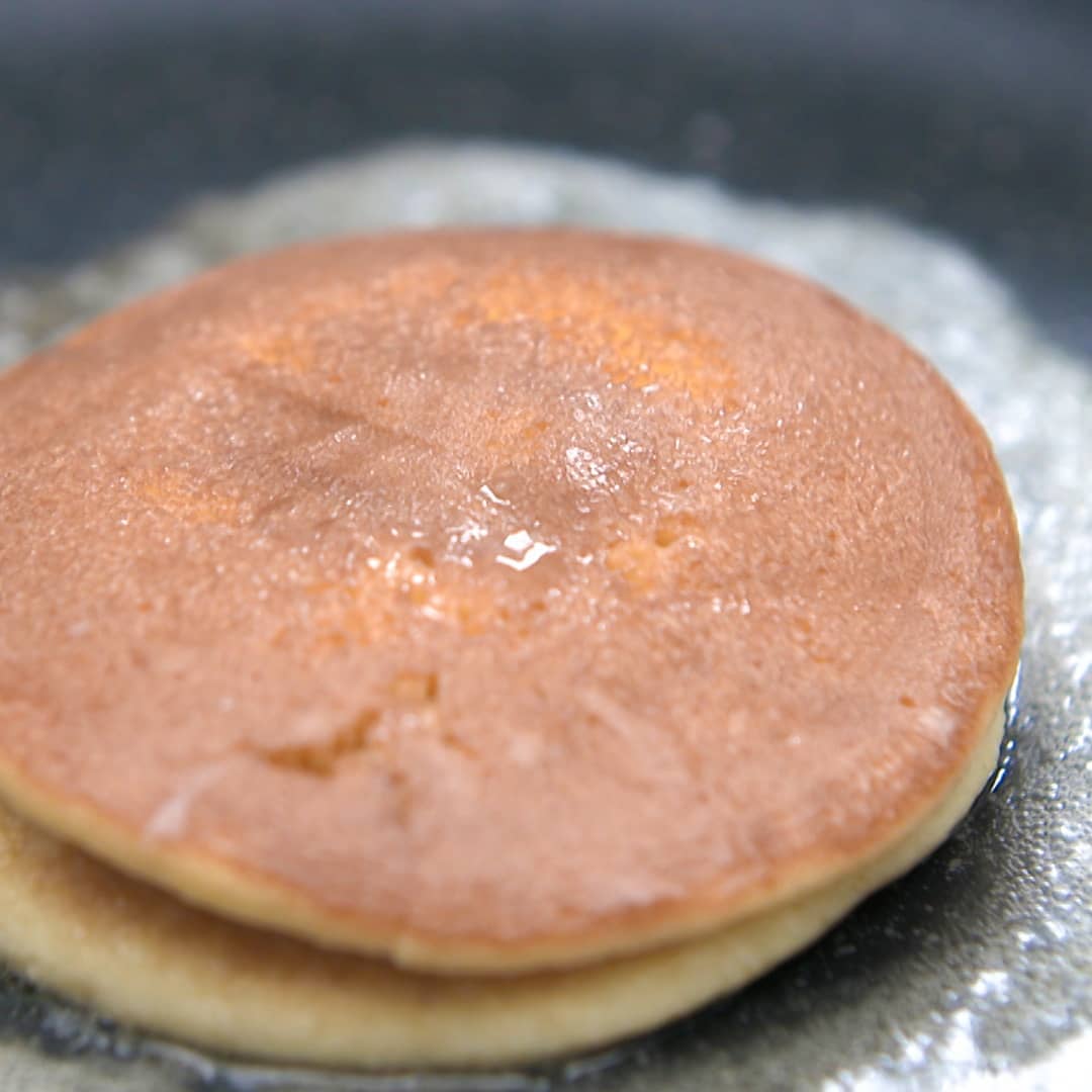 ④つけ込んだどら焼きをフライパンに入れたらフタをして弱火で1分半、軽く焼き目がつくまで焼く