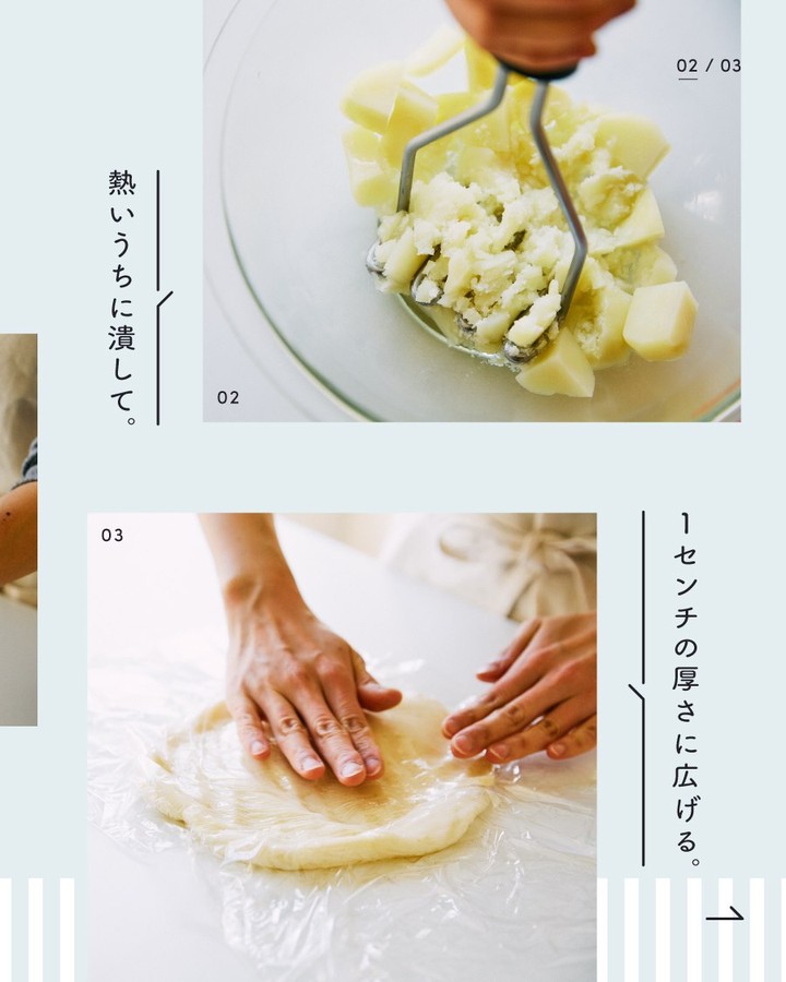 3. 熱いうちにマッシャーで滑らかになるまで潰し、有塩バターを加えて混ぜます。粗熱を取り、卵白、①を加えて混ぜ合わせます。