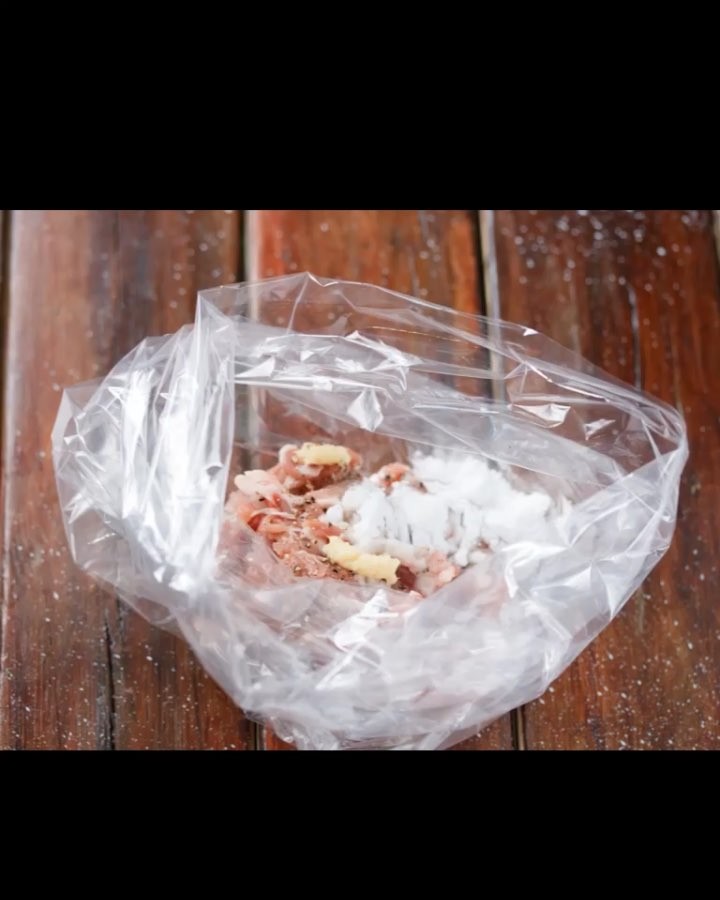 ②舞茸をほぐして加え、優しく揉みこむ。そのまま10分ほどおく。(この段階で密封袋などに入れ、冷凍保存が可能!)
