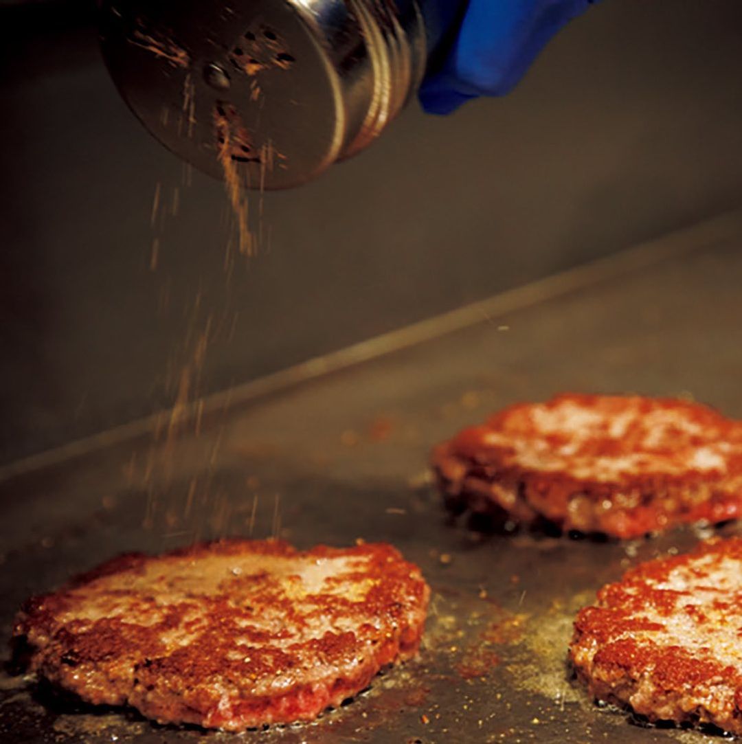 オーストラリア産ビーフの肩ロースを使用する赤身肉100%のパティは、180℃の鉄板で両面を焼き上げ、塩胡椒で味付けを加える。