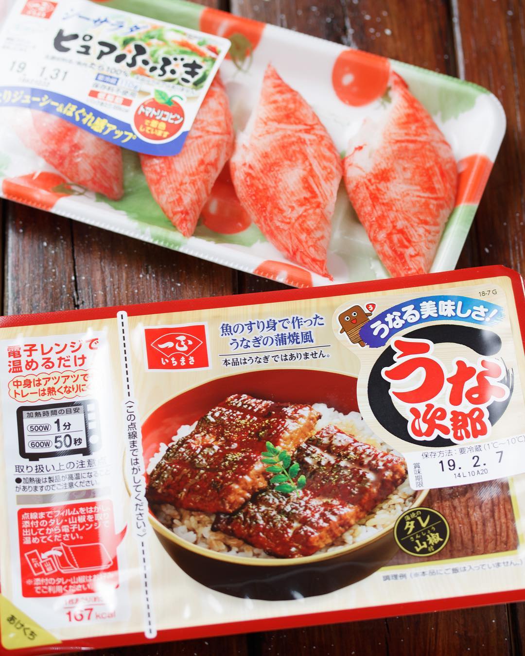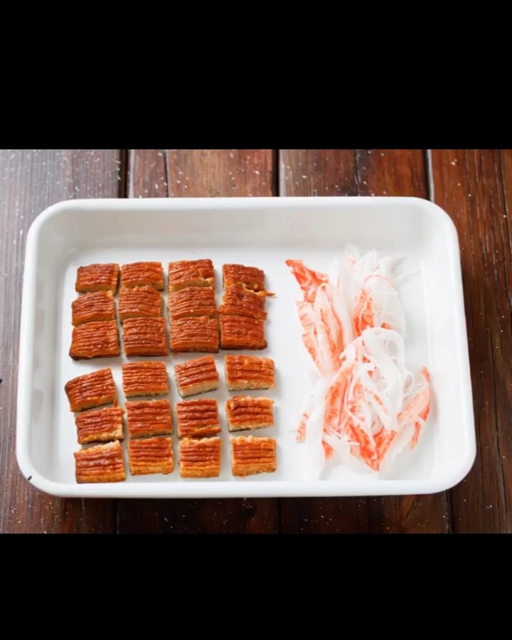 ①うな次郎は、電子レンジ600wで約50秒加熱し、12等分に切る。シーサラダピュアふぶきは、手で裂く。