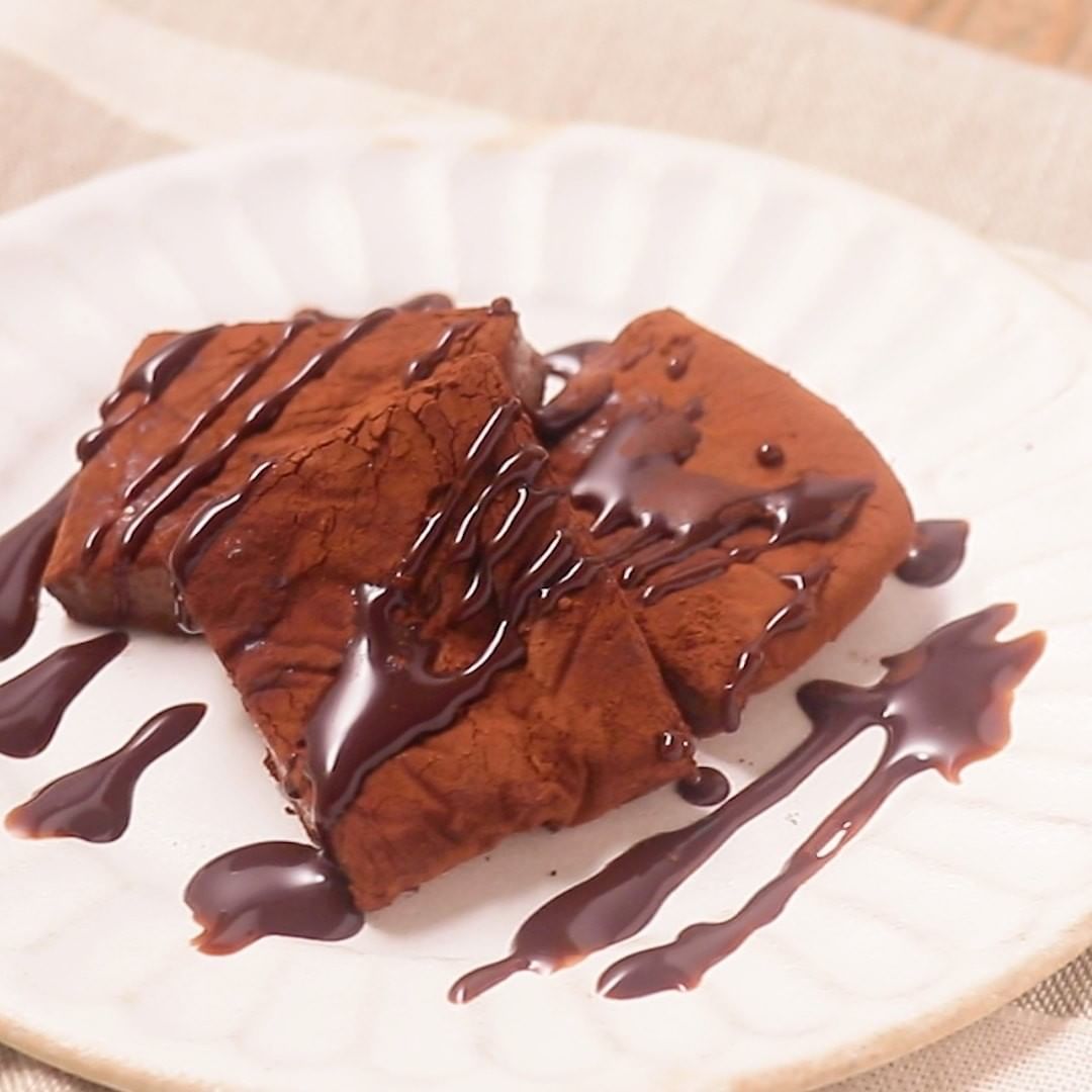 6. 冷蔵庫から取り出し、食べやすい大きさに切って器に盛り、チョコレートソースをかけて完成です。