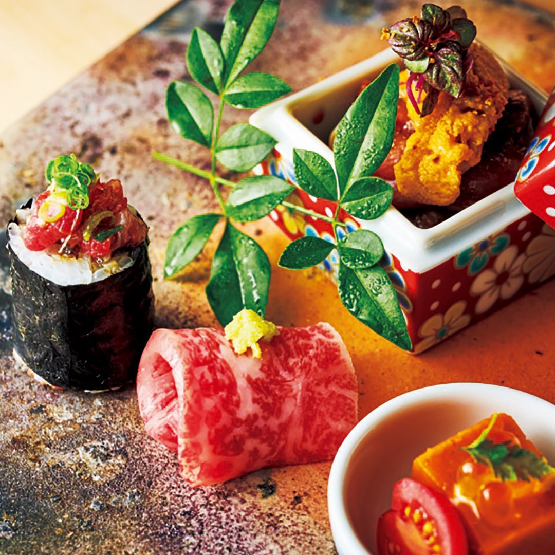 サーロインの刺身のほか、牛トロタクの巻物、リブロースのすき焼き風などを盛り込んだ八寸スタイル
