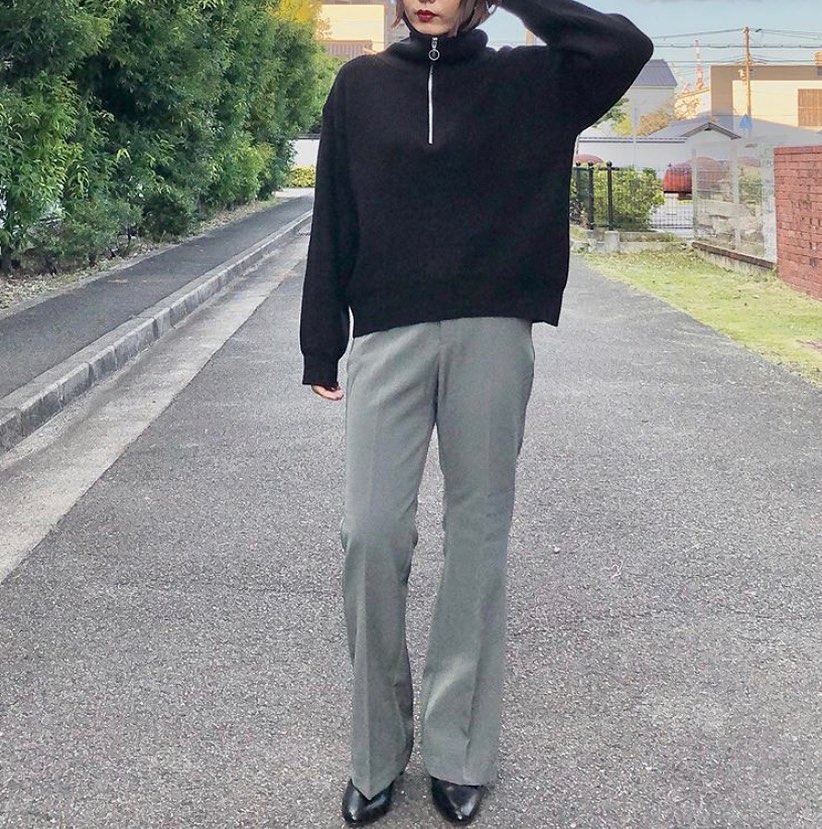 オーバーサイズハーフジップセーターコーデをPick up!ビックカラーの襟のアレンジの仕方で、雰囲気を変えられるお洒落なセーター✨ジップアップを上げた着こなしも、素敵ですね😘ぽわんとしたオーバーサイズのシルエットが、ゆる可愛さもプラスしてくれて、とってもいい感じです👌
