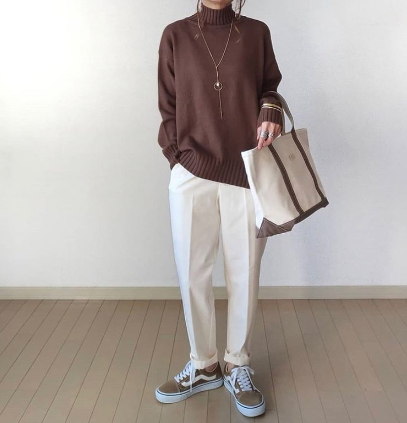 ざっくりとしたシルエットが魅力の、オーバーサイズハイネックニットチュニック✨ダークブラウンがお洒落で👍かっこいい😘キレイめボトムスにも、ぴったりですね👌あえてのスニーカー合わせも、自然体でいい感じ👏今の時期のおすすめコーデ🙌