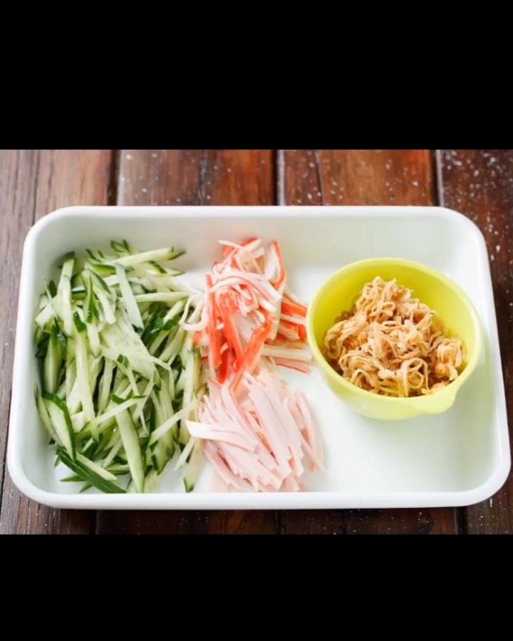 ①切り干し大根は、流水でよくもみ洗いする(水には浸さない)。カニカマは手で裂き、ロースハムは細切りにする。きゅうりは斜め千切りにする。