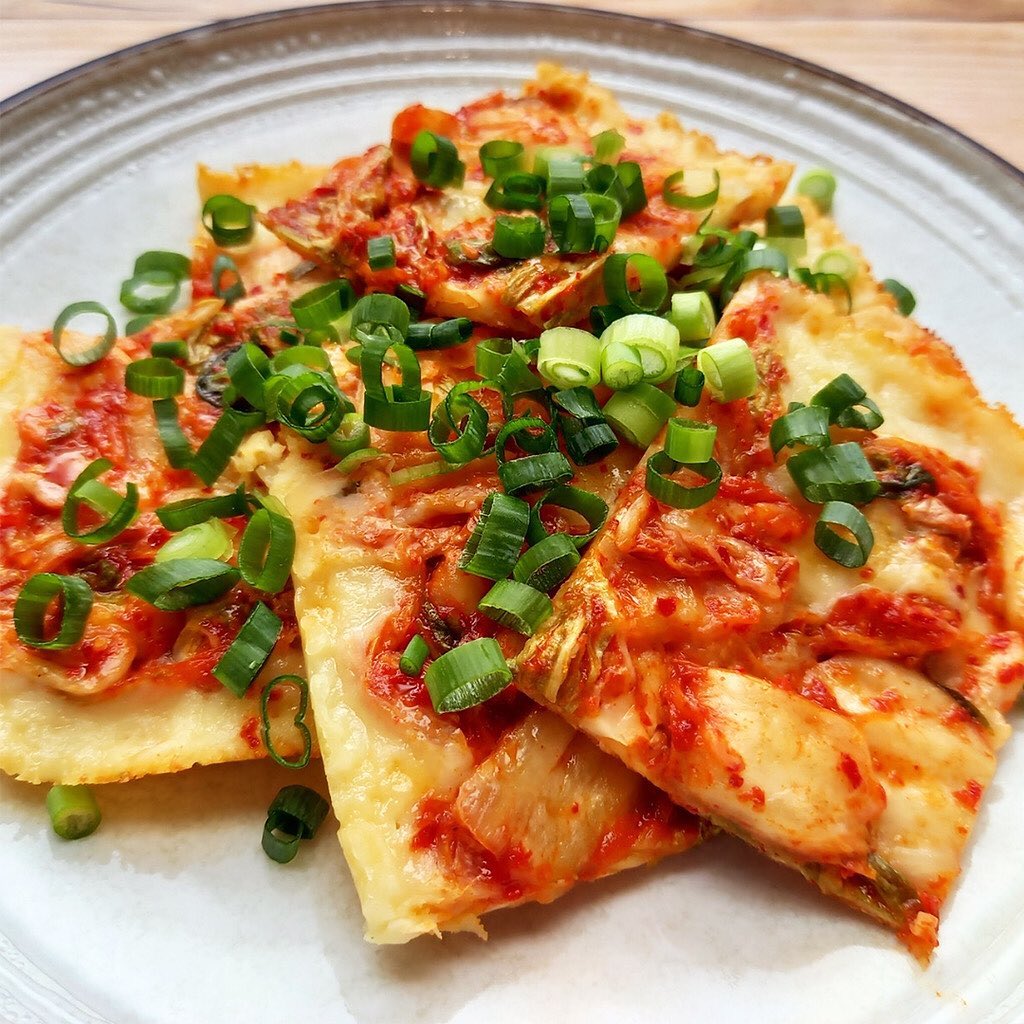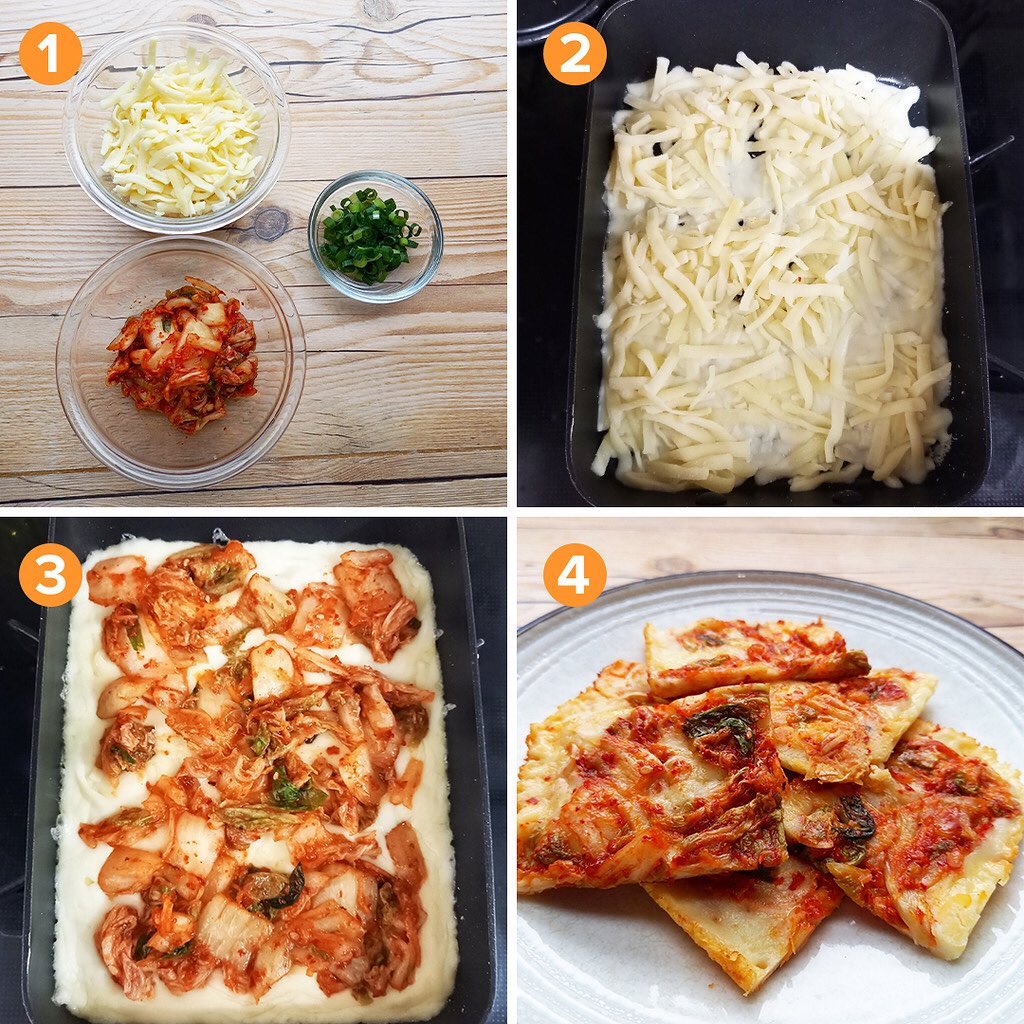 2. チーズが溶けてきたら、キムチを敷き詰め、弱火で5分ほど焼く。