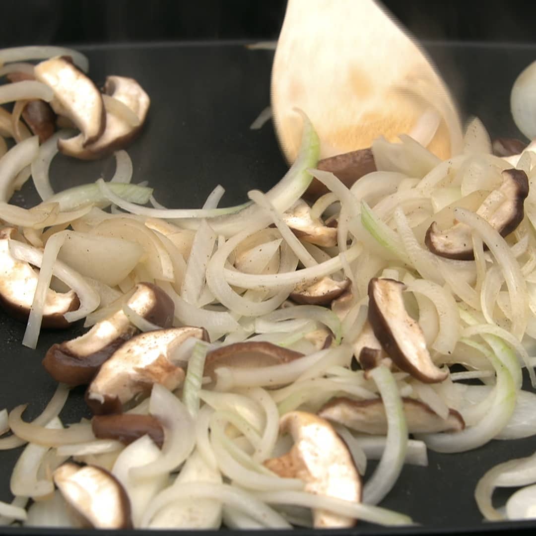 ②薄切りにした玉ねぎ(2個)しいたけ(6個)を加え塩コショウ(適量)で炒める