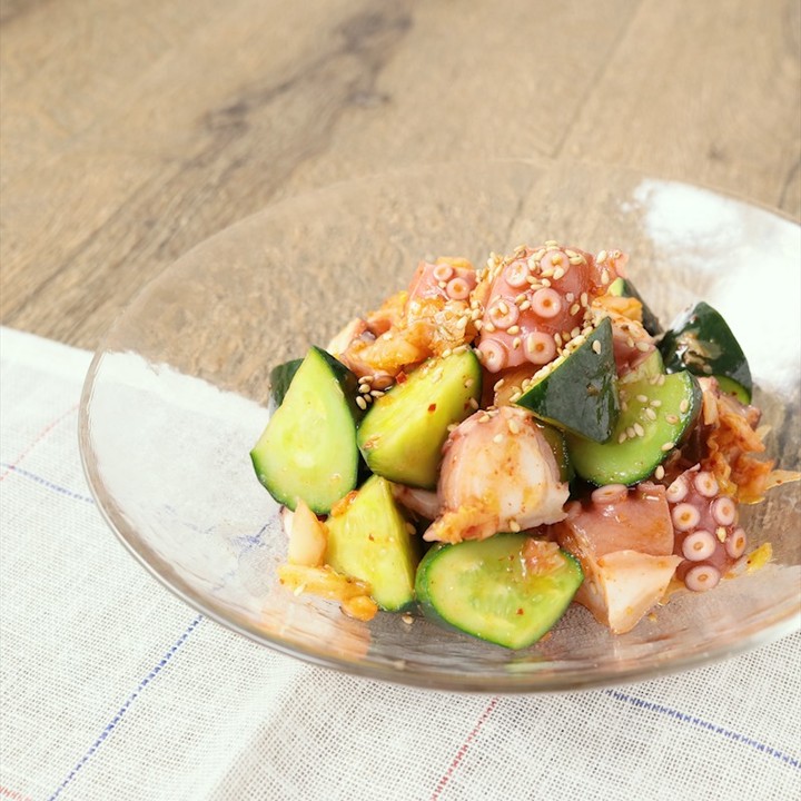 きゅうりはタコと形を揃えるため、乱切りにしていますが、たたききゅうりにしてもキムチやゴマ油が絡みやすくおすすめです。