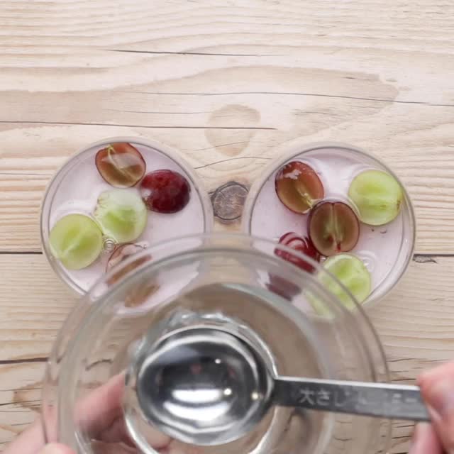 7.(3)の容器にカットしたぶどうの半量と(5)の半分の量を流し入れ、ラップをして冷蔵庫で1時間ほど冷やす。