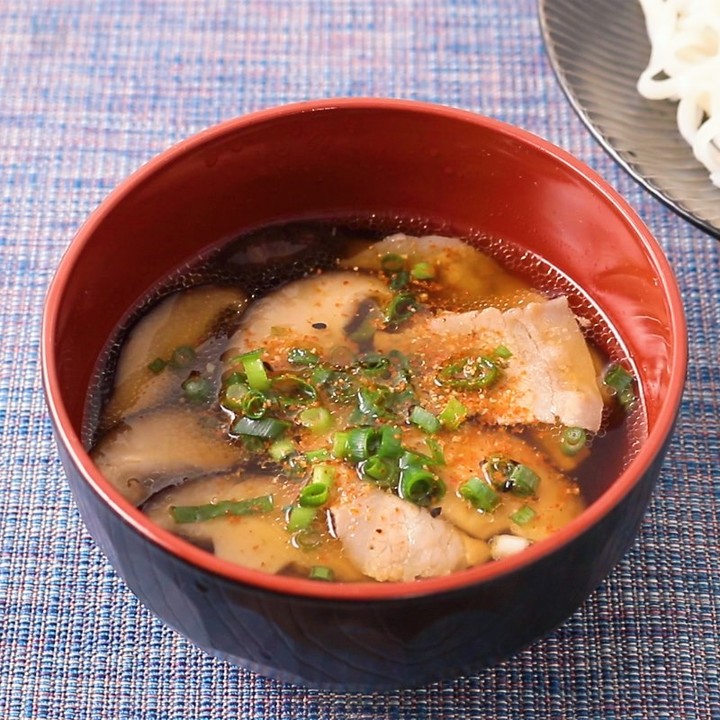 簡単に作れる、豚バラとしいたけのつけうどんはいかがですか。豚バラ肉としいたけの旨味が溶け出したスープに、のどごしの良いつるつる食感のうどんが絡んで、とってもおいしいですよ。簡単に作ることが出来るので、ぜひお試しください。