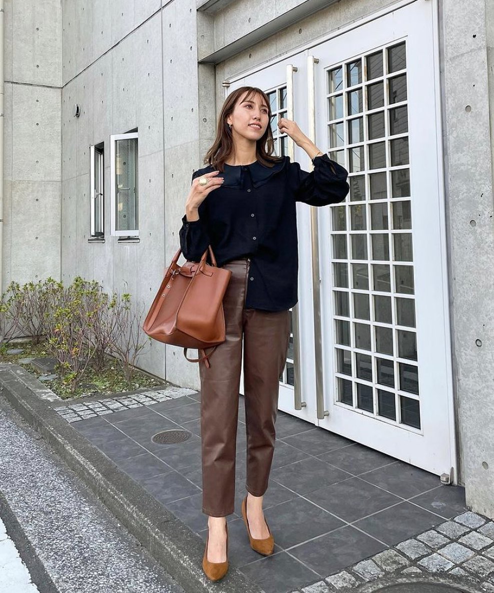 トレンドのシアー素材と、フェミニンながら、品のある襟が特徴のシアーカラーブラウス✨シンプルにレザーパンツと合わせたスタイリングが、甘辛MIXでとっても素敵😘透けすぎないシアー素材で、インナーで調節して着こなせるのもGOODです👍