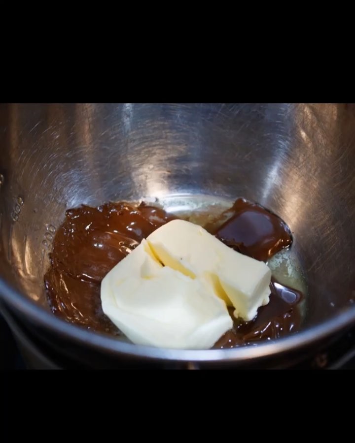 ①ボウルに、手で割った板チョコ・無塩バターを入れて湯煎にかける。