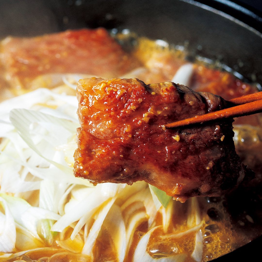 ②「都萬牛の牛鍋」は、鍋の味つけに負けない濃厚な味わいを持つ、リブロース芯に近い「マキ」を使う。