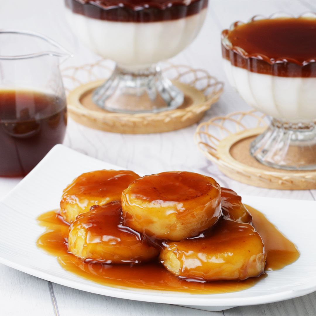 4.フライパンにバターを中火で熱し、両面を焼く。焼き色がついたらみたらしだれの材料を入れて煮絡める。お皿に盛り付けたら、完成!⁣
