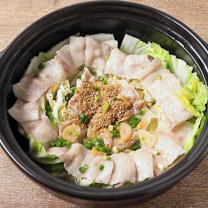 今晩のお食事に、やわらか白菜と豚バラ肉の鍋はいかがでしょうか。旨味たっぷりでジューシーな豚バラ肉と、やわらかい白菜がたっぷり入って、ニンニクとごまが香るおいしい鍋ですよ。とても簡単なので、ぜひお試しくださいね。