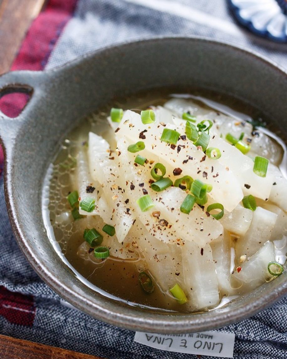 ③【a】を注いで大根を加え、5〜6分ほど煮る。大根が柔らかくなったら、水菜を加えてサッと煮て火を止める。お好みで、粗挽き黒胡椒とごま油をふる。時間があれば一旦冷ますと、より味が染みます。