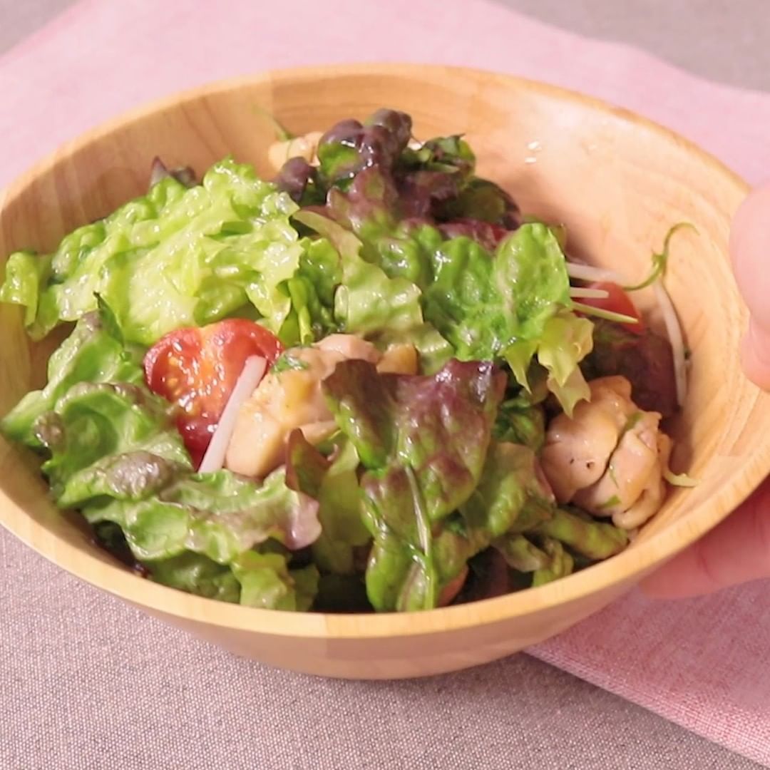 こんがりと焼いた鶏のソテーをサラダに混ぜ合わせました。食べ応えもあり、朝食や、間食にもぴったりですよ。パンに挟んでサンドイッチにしてもおすすめです。豪華でおいしいですので、ぜひ一度作ってみてくださいね。