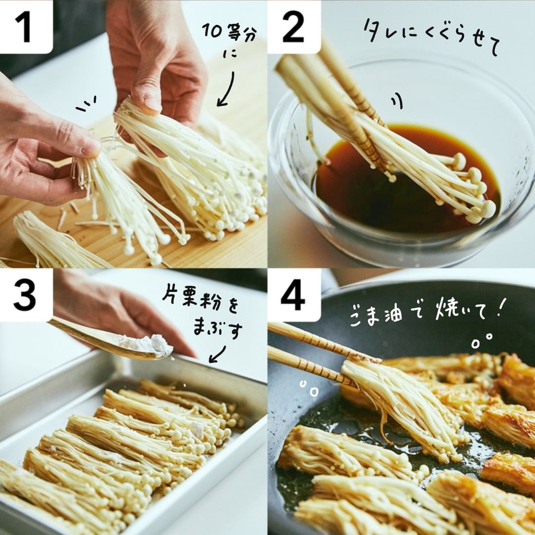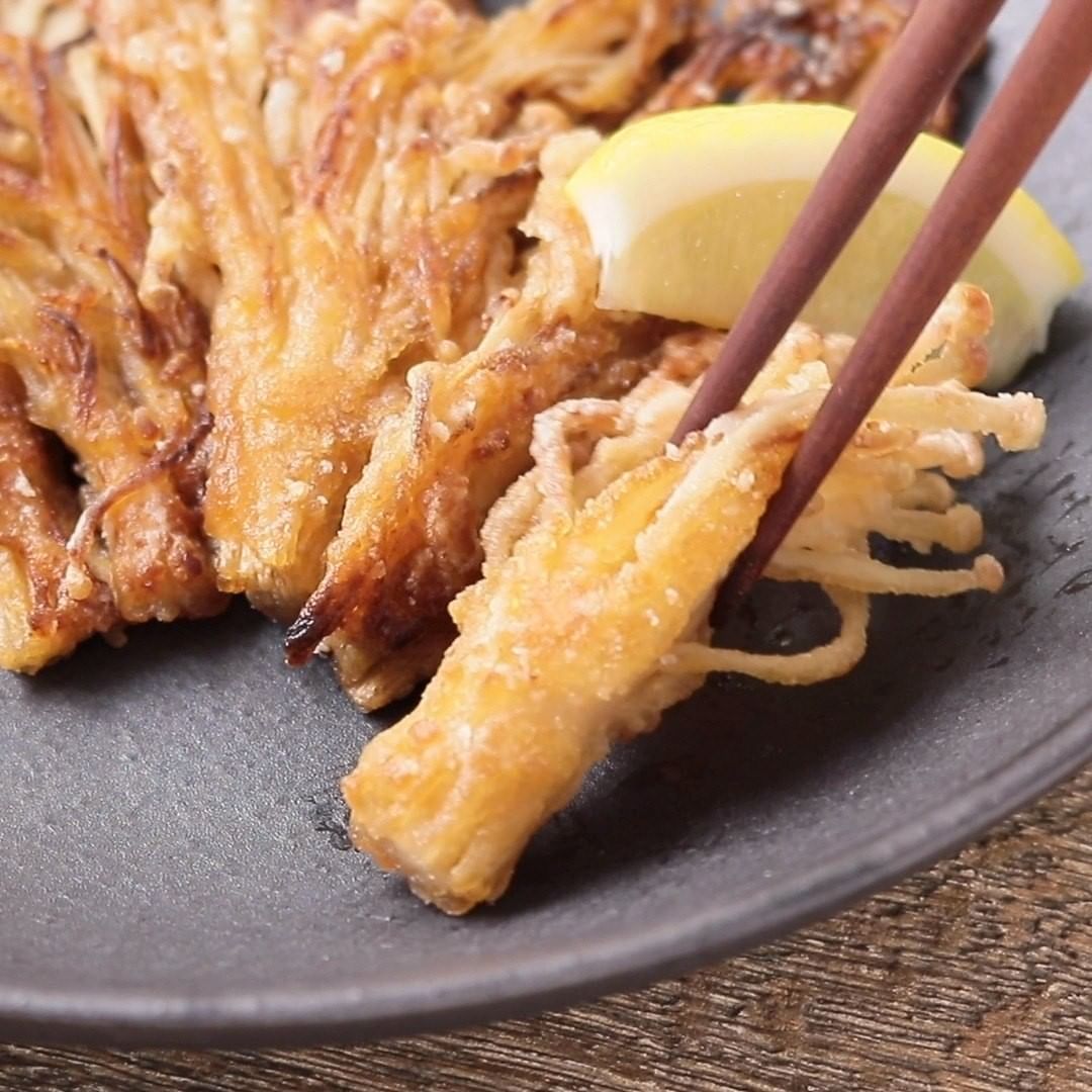 えのきで作る唐揚げ風のおかず、おつまみえのきはいかがでしょうか。さっと下味を付けたえのきに片栗粉をまぶしてごま油で焼きました。ごま油の風味よく、カリカリの部分もあり、食感も楽しい一品です。ぜひ、お試しください。