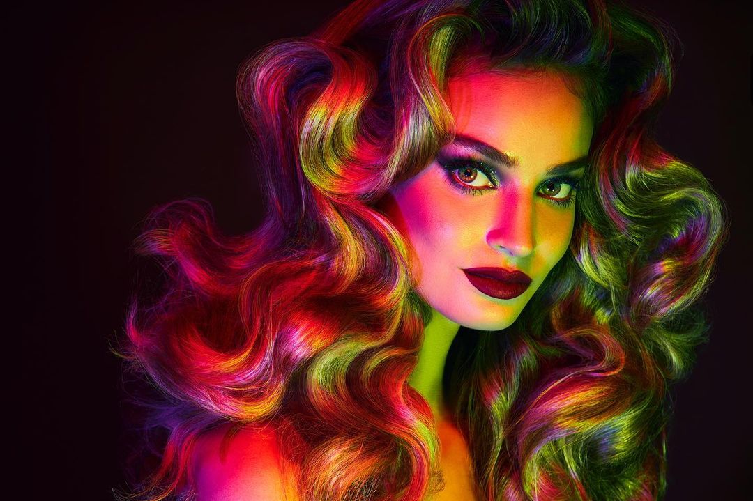 For this shot my main light was a Magnum reflector (hard light modifier) with a red gel and two zoom reflectors (one green and one blue) offset below my subject. Of course the incredible hair and makeup helped to make this shot even more eye-catching!