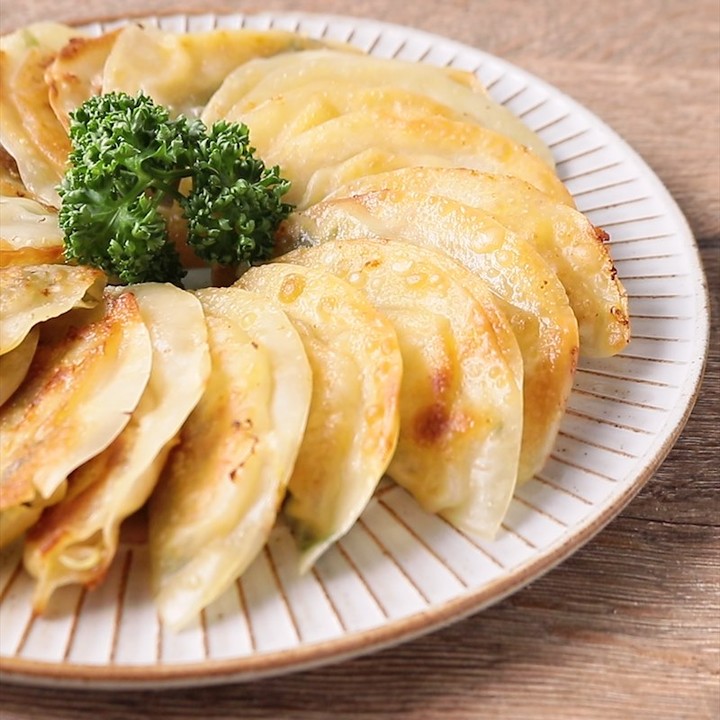 餃子の皮はお好みの形で包んでください。焼く時チーズが溶け出ないよう、しっかり縁を閉じてください。蓋をして焼くと蒸し焼きに、蓋をせずに焼くとカリカリに仕上がります。