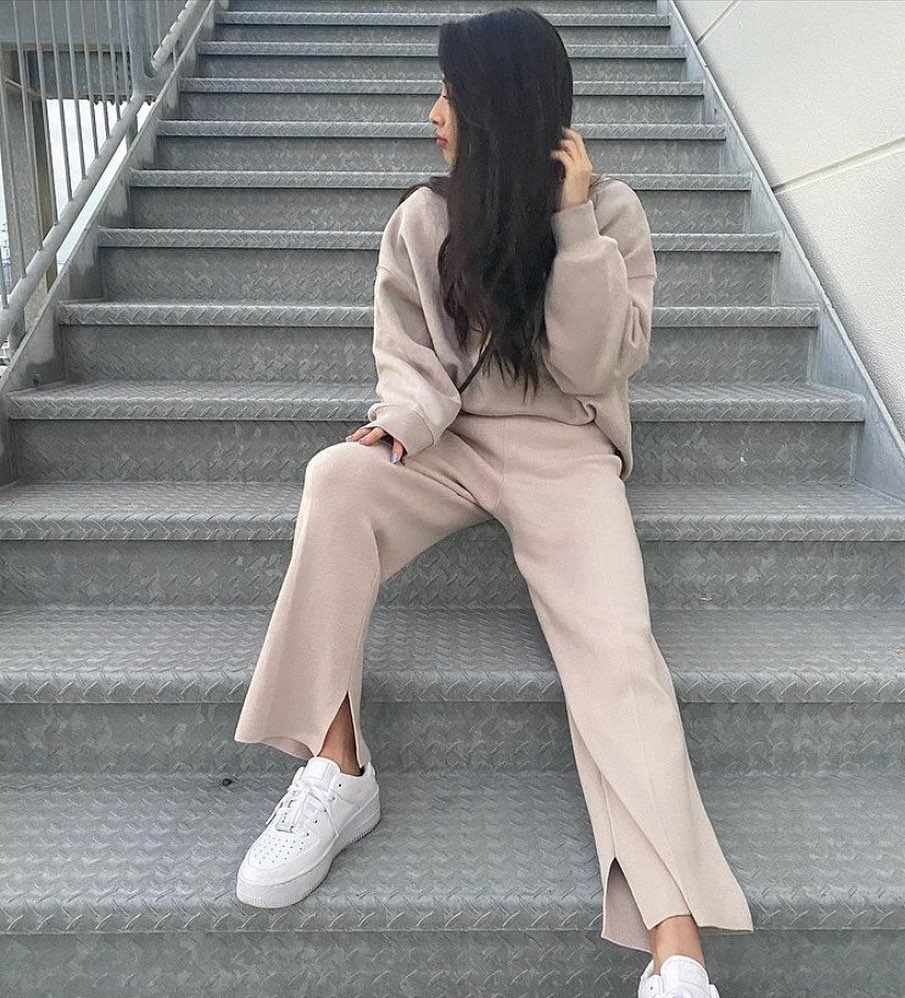 スウェットライクニットスラックスコーデをPick up!暖か素材のスウェットライクニット✨ボトムスだって、暖かいのが良いですね👌スリットが可愛くて、スニーカーと合わせたカジュアルコーデにもぴったりです😘