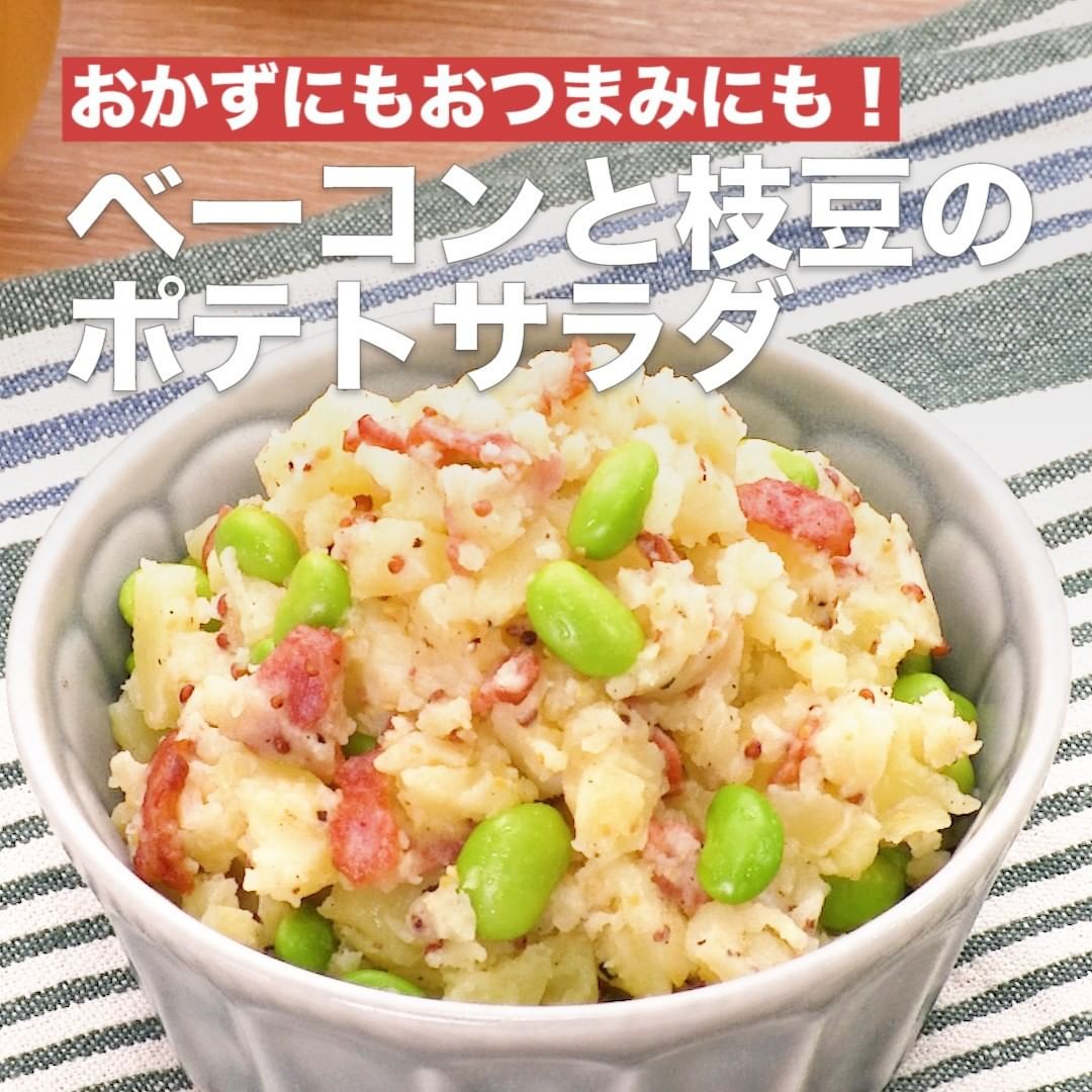 ベーコンの塩気と旨みがきいたポテトサラダのレシピです。枝豆は冷凍のものを使うので簡単に作れます♪おつまみにもおすすめです。