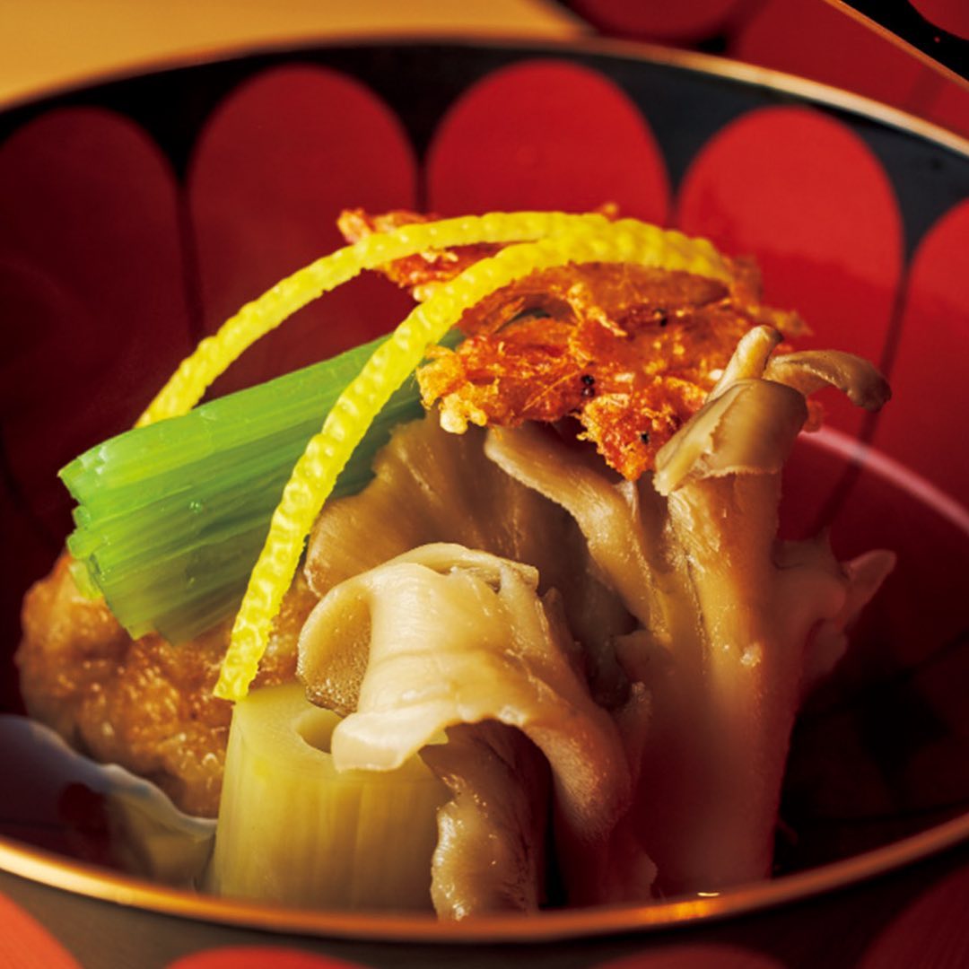錦秋をイメージした中身は、用宗のワタリガニをふんだんに使った海老芋ベースの蟹真薯、京壬生菜に岩手産舞茸など。