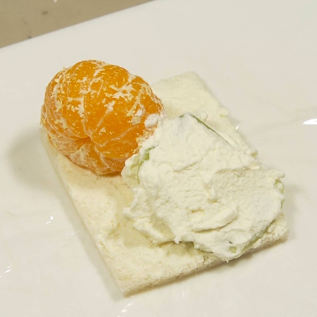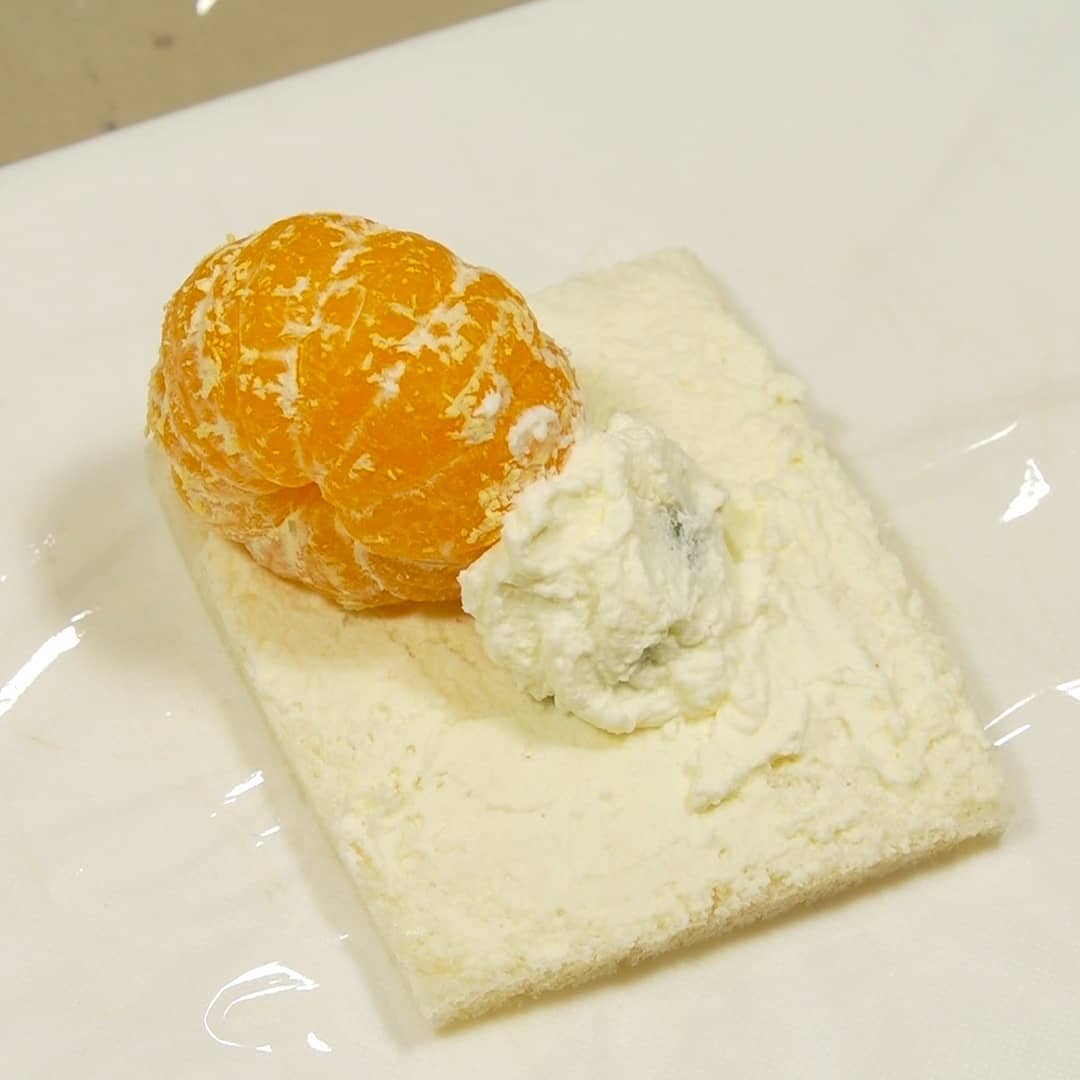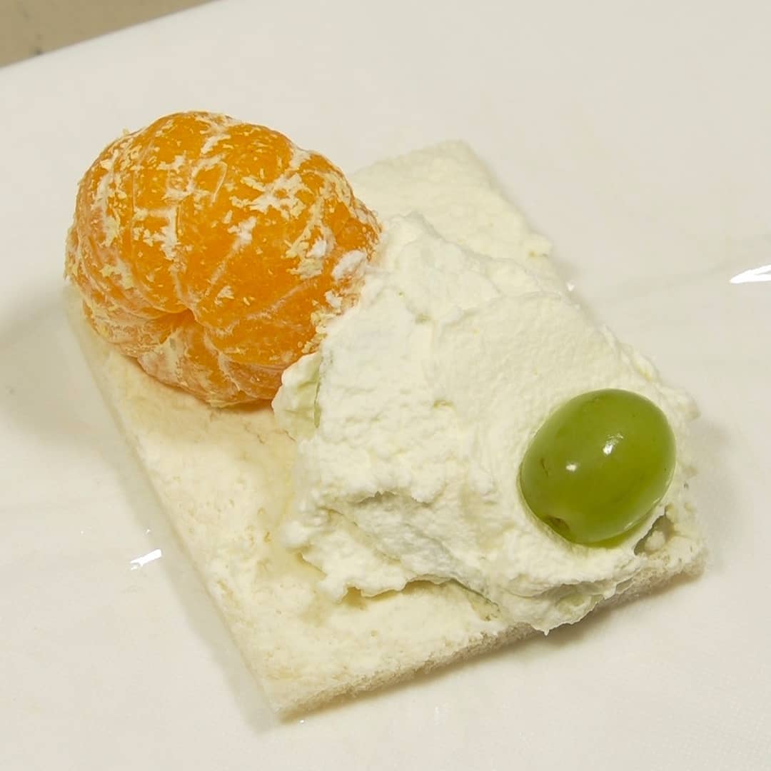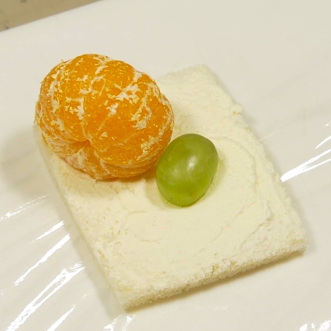 ③みかんの斜め下にマスカット1粒を置きクリームを塗る
