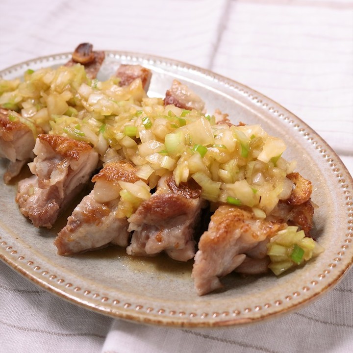 パリッと焼いたチキンステーキにネギの旨味がたっぷりのソースをかけてお召し上がりください。ニンニクバターの香りがよく、さっぱりとしたネギだれがよく合います。肉の旨味が溢れ出し、パクパク食べられますよ。是非お試しください。 .