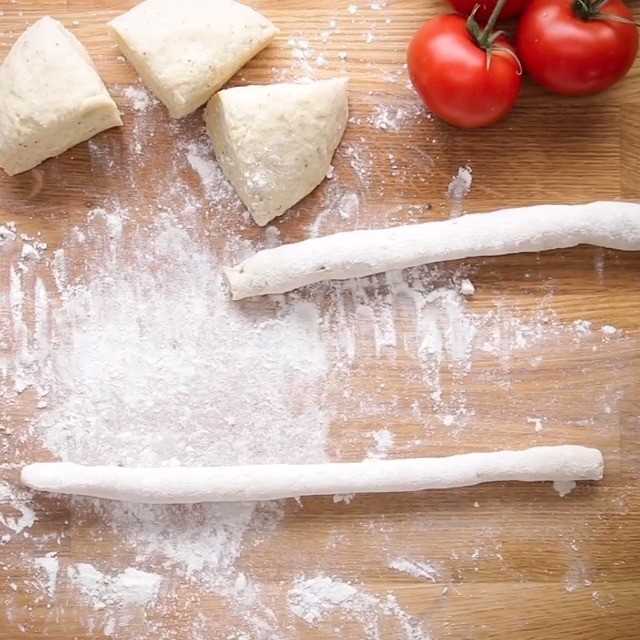 4. (3)を作業台に載せる。薄力粉2分の3(約130g)を上から振りかけて素早くこねる。ベタつく場合は残りの薄力粉を少しずつ加える。生地がまとまったら4等分に分け、直径2.5cmのロープ状になるまで伸ばす。ロープ状の生地を2cmほどの幅で四角く切り分けて薄力粉をまぶす。残りの生地も同じようにする。