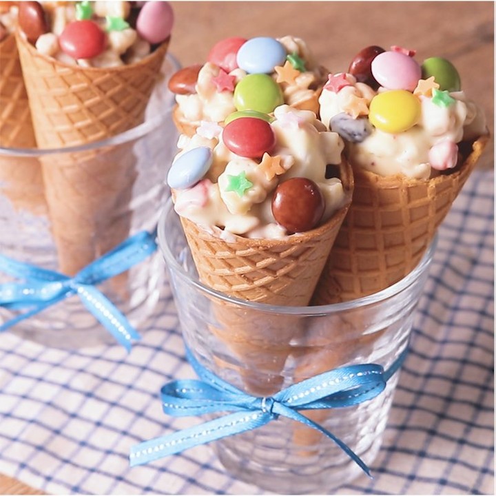 4. 全体がなじんだらシュガーコーンにのせ、マーブルチョコとトッピングシュガーを飾ります。