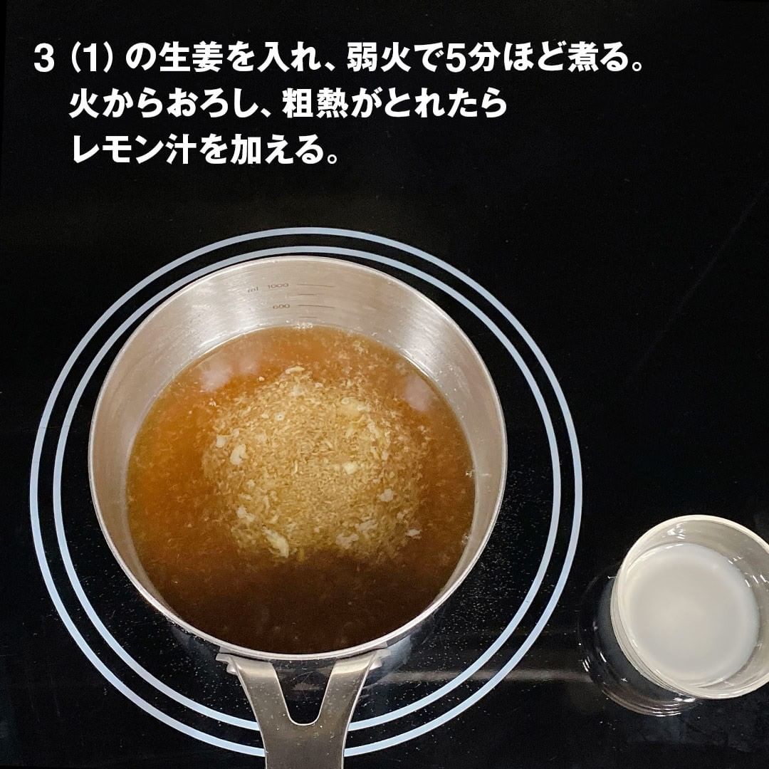 3.(1)の生姜を入れ、弱火で5分ほど煮る。火からおろし、粗熱がとれたらレモン汁を加える。