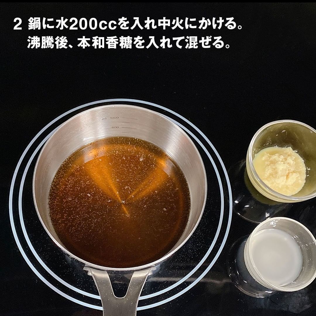 2.鍋に水200ccを入れ中火にかける。沸騰後、本和香糖を入れて混ぜる。