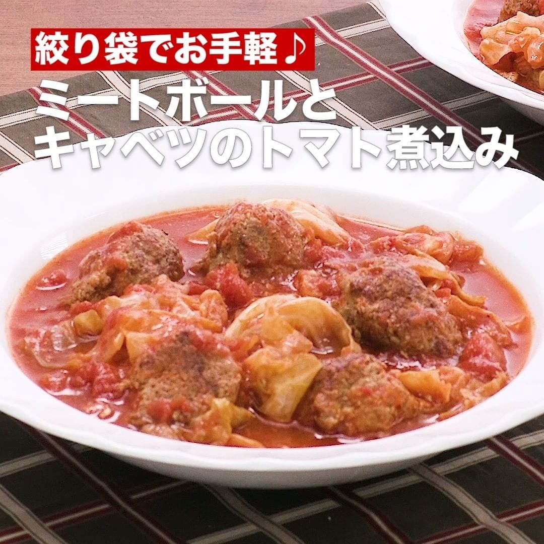 ④<絞り袋でお手軽♪ミートボールとキャベツのトマト煮込み>