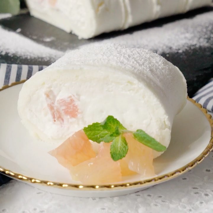 6.オーブンシートの上に焼いた生地の焼き面を上にしてのせる。巻き終わりを3cm残して、クリームを塗り、グレープフルーツを散らす。手前から巻いていき、巻き終わりを下にして、30分ほど冷蔵庫で寝かせる。⠀