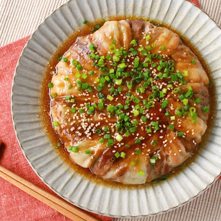 フライパンにお肉やねぎ、えのきをぎゅうぎゅうに詰め込んで丸ごと焼きました。お皿にどかーんと乗せれば見た目のインパクトも大!家族みんなで食べるのも楽しいですよ。おつまみにもオススメです。ぜひ作ってみくださいね。